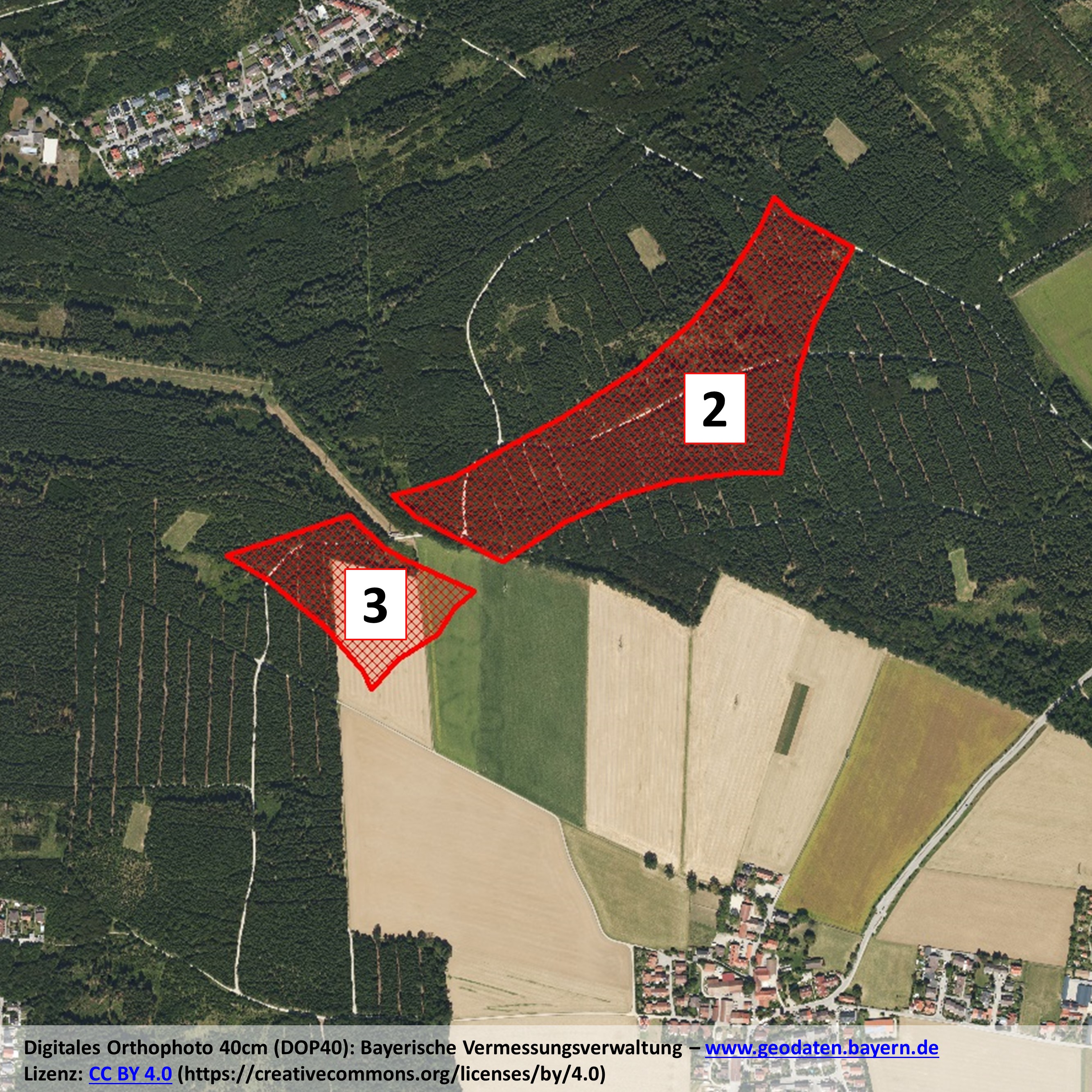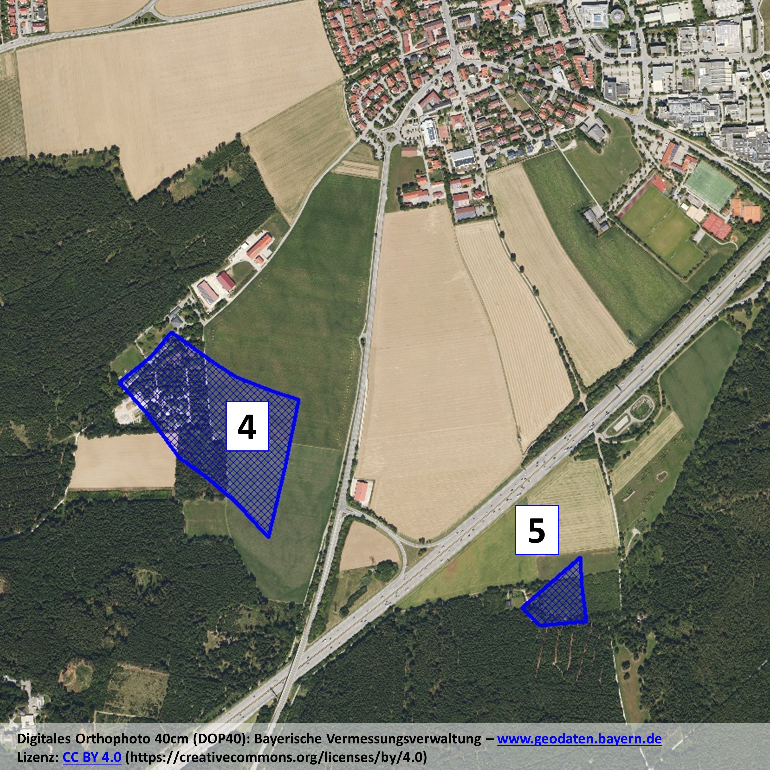 Da die Übersichtskarte aus den Sitzungsunterlagen etwas unübersichtlich war und auch keine Flächenangaben enthielt, haben wir die Karte für unsere Fraktionssitzung nachträglich georeferenziert und markierten Gebieten in die im BayernAtlas verfügbare digitale Ortskarte von Putzbrunn übertragen.